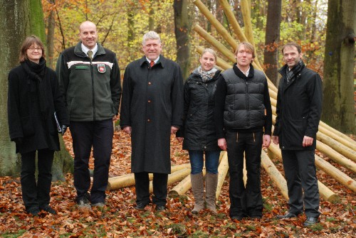 Weihten gestern den Ruheforst Rutenmühle feierlich ein: Pastorin Maren Zerbe, Rudolf Alteheld (Landwirtschaftskammer Niedersachsen), Jost Arnold (RuheForst GmbH), Waldbesitzer Juliane Heino und Johann Kath, Carlos Brunkhorst (Bürgermeister Gemeinde Neuenkirchen)